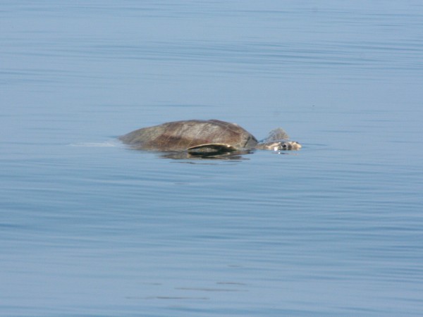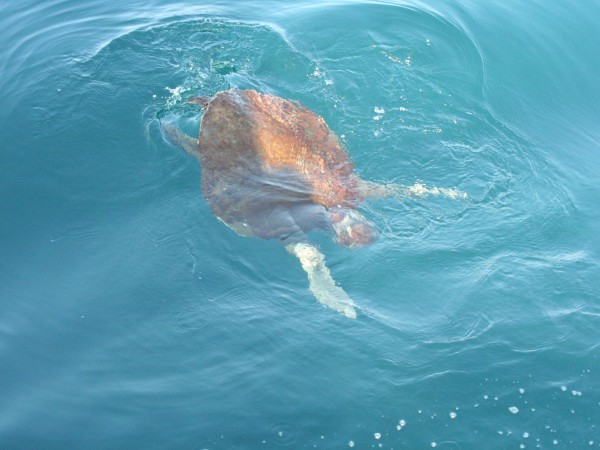 As we cruised through the waves on a bright sunny day, we soon saw another shape off in the distance. A closer look revealed a giant sea turtle floating on the surface. He must have been enjoying a good nap because he remained completely still as we approached. Just when we began to wonder if he was even alive, he abruptly woke up, noticed us (no doubt with some surprise), and dove down as fast and deep as his flippers would carry him.