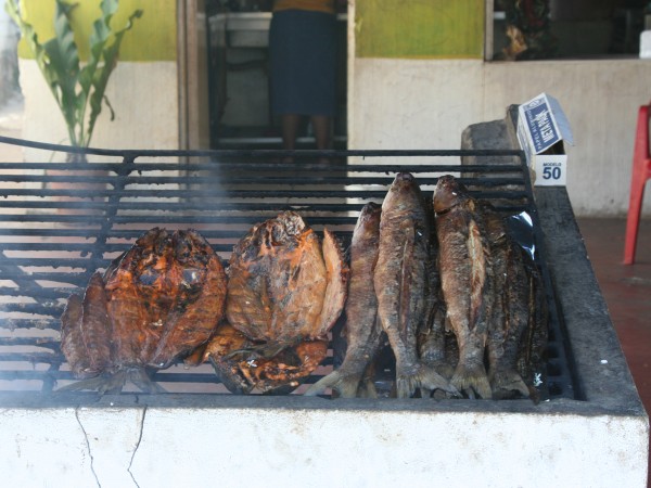 Sara and I continued down the hill and turned back towards town, coming upon several outdoor restaurants serving fresh smoked fish. We couldn't pass it up and took a seat amongst the locals at a little place. We asked for one piece of fish to share and soon had a table covered in plates; our one piece of fish was huge and was accompanied by many fresh salsas, rice, and warm tortillas.