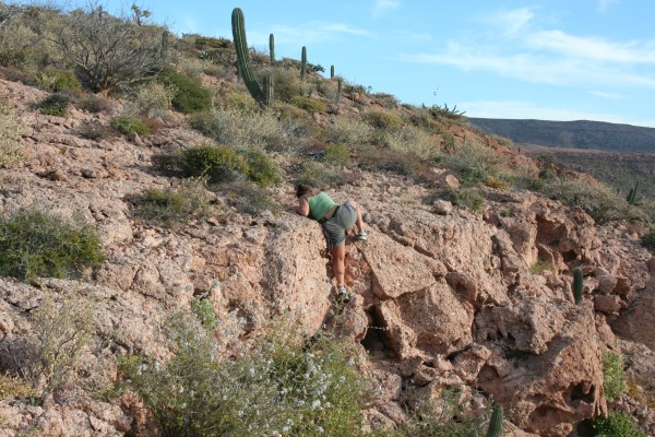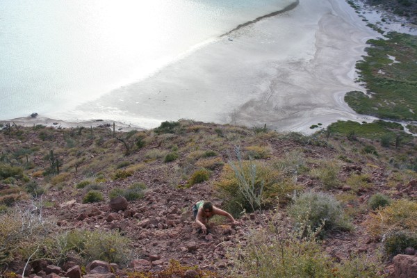 We had a great lunch, and while Jeff and Sara chilled out and took naps, Angela and I decided to climb one of the mountains surrounding the anchorage. There aren't any paths or trails or anything, we just dinghied into shore, left Purpeat in the tidal flats (firmly anchored, of course), and started walking uphill.