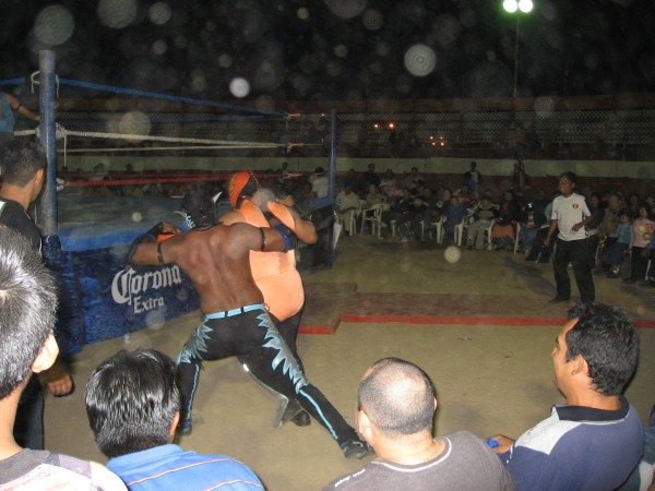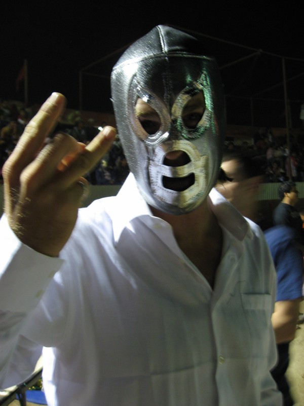 Lucha Libre means "freestyle", which we were hoping would be a no-holds-barred brawl. Unfortunately it turned out to be WWF-style theatrics played out by the classic good-guy, bad-guy, comic-relief-guy we all know so well. The Mexican twist on wrestling is that everyone wears a Lucha Libre mask!